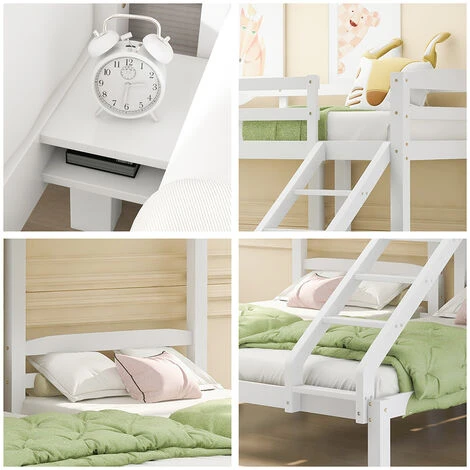 The inclined ladder allows children to easily climb up and down from the bed. The bed frame is made of selected solid pine wood and iron alloy bolts to keep the whole bed firm and not shaking. The upper bunk has high railings to ensure a safe and worry-free night.