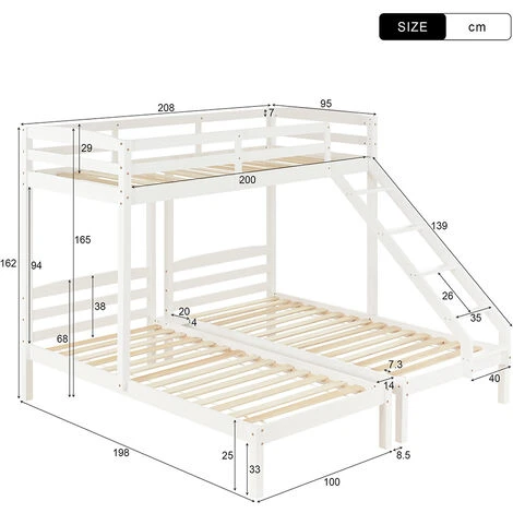 With a top bunk of 90x200cm and two single beds of 90x190cm, this triple bunk bed uses the vertical space to provide convenient and flexible layout options for large families and overnight stays. This bed can accommodate 3 people to enjoy together.