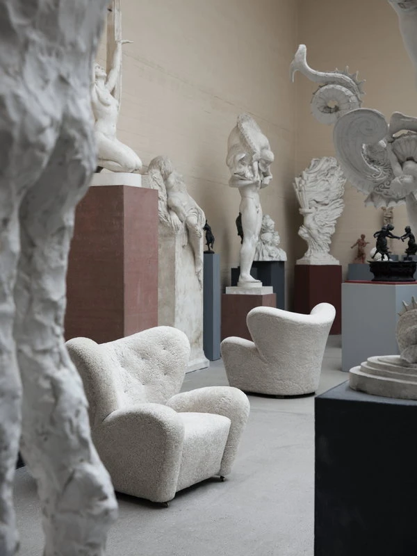 By Lassen’s The Tired Man, designed by the Danish architect Flemming Lassen, is a voluminous easy chair upholstered in white, genuine sheepskin. The Tired Man was first introduced at the Copenhagen Cabinetmakers’ Guild Competition in 1935. According to Flemming Lassen, sitting in the chair should feel ”as warm and safe as a polar bear cub in the arms of its mother in the middle of the ice cap”. The soft and imposing armchair invites you to spend relaxed moments and enjoy the timeless feeling and quality of Danish design.