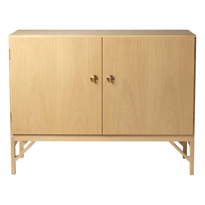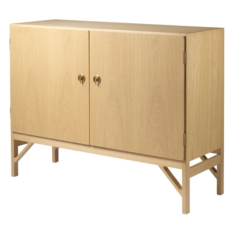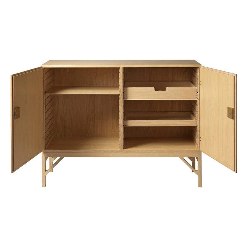 FDB Møbler’s A232 sideboard is a graceful oak wood cabinet designed by Børge Mogensen in 1964. A fine example of Mogensen’s clean and functional style, the A232 sideboard features a sleek wooden construction with brass-coloured metal knobs and two compartments behind the doors. You can use the compartments as they are, or customise them with shelves and drawers, which are sold separately.