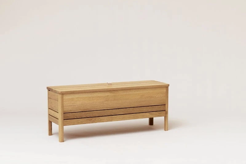 Form & Refine’s A Line stowaway bench is constructed from solid oak and finished with a leather handle on the cover. When opened, the cover folds neatly behind the bench, revealing the two storage compartments inside. The compartments can be used, for example, for storing shoes and accessories in the hallway, bedding in the bedroom or supplies in the office. The bench can fit three persons.