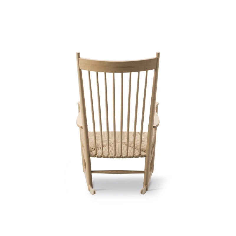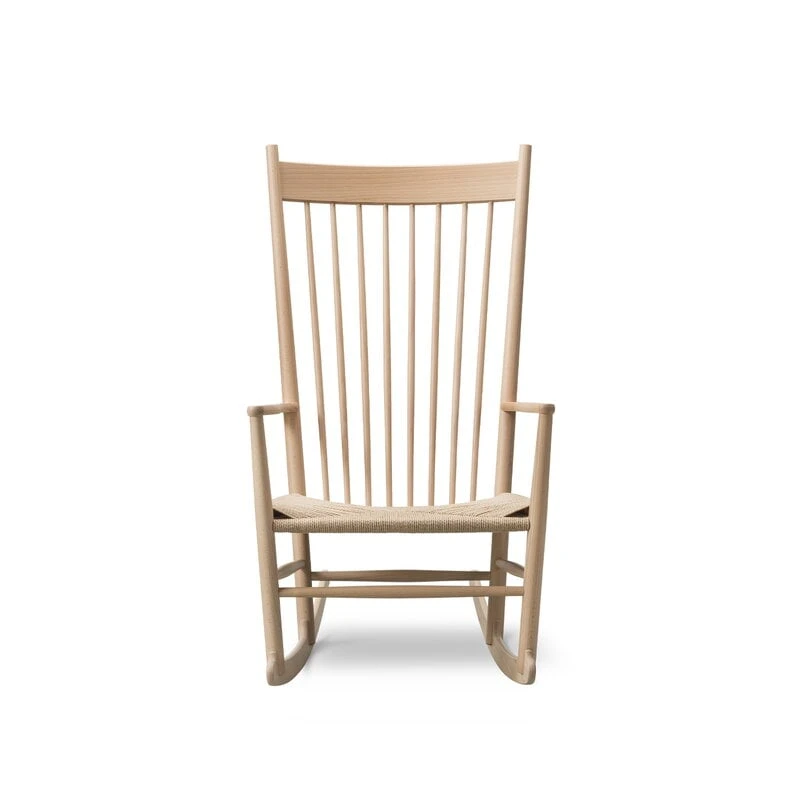 Fredericia’s J16 is a wooden rocking chair designed by Hans J. Wegner in 1944. The rocking chair is characterized by elegant, curved lines and spindles inspired by English Windsor chairs. The seat has been corded by hand from natural paper yarn, while the frame is made from soap-treated oak that will develop a lovely patina over time and use.