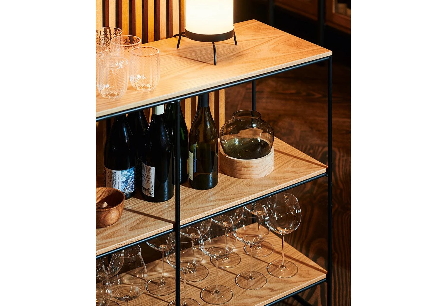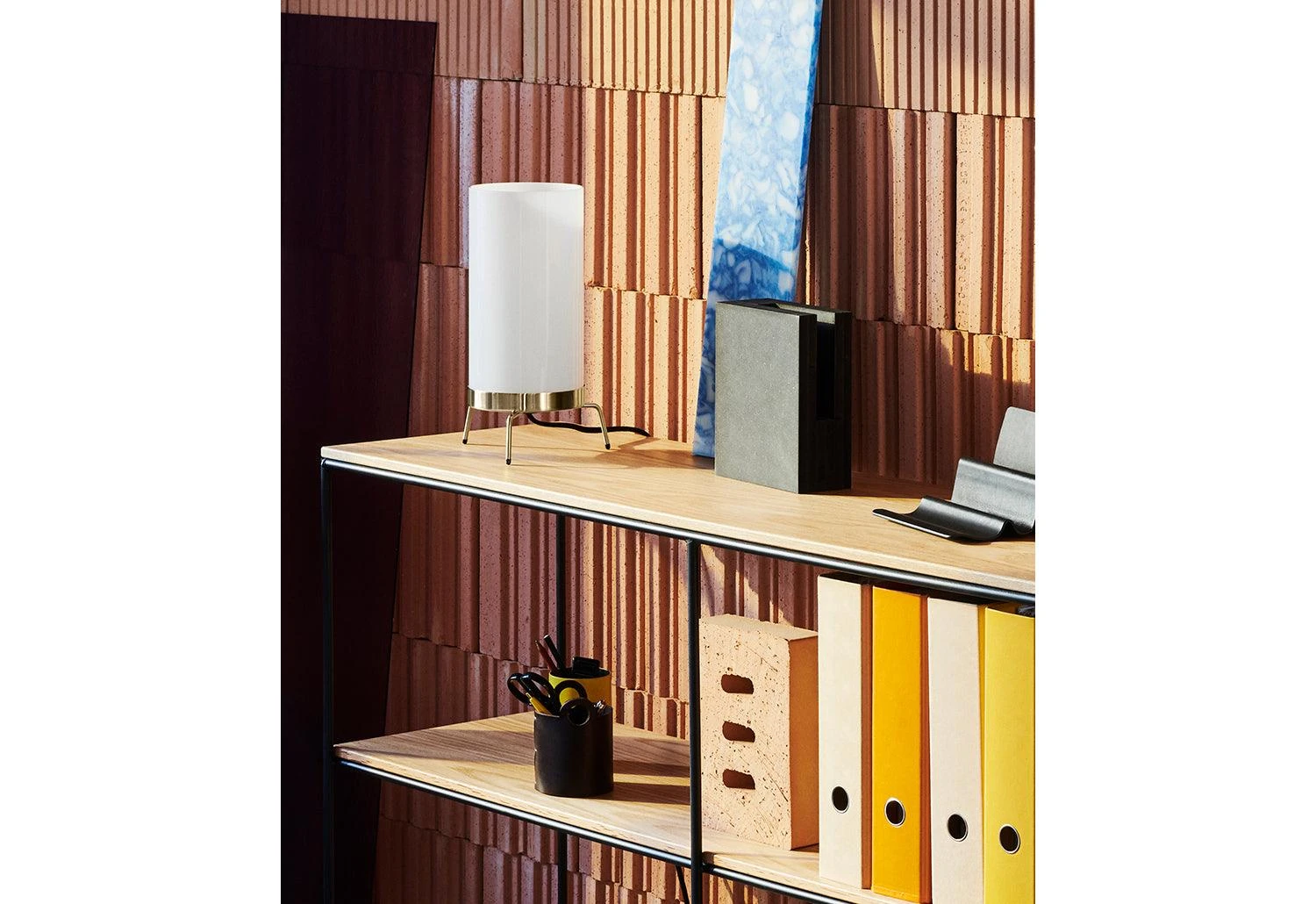 The contemporary and democratic designer created the shelves to be versatile. Use as a room divider and storage space, whilst maintaining a bright and open space.