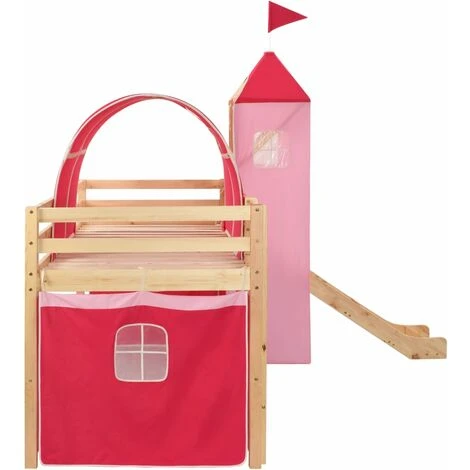 This princess-themed children’s loft bed will be a real eye-catcher in your kid’s bedroom. The wooden loft bed has a solid construction and is delivered with the bed slats, a slide, a ladder, and a princess-themed tent, side covers and a canopy. Guard rails on both bed edges will keep your little princess in the bunk. The space underneath the bed transforms into the princess’s dress room with the included sidewalls with windows. Additionally, the loft bed is distinguished by an entertaining slide and a ladder, both of which can be covered with the included tent. The slide and the ladder can be assembled either on the left or right, and a canopy for covering the bed is also included. The bed is suitable for 90 x 200 cm mattress. Your little one will love sleeping and playing in this dream space! Please note that the mattress is not included in the delivery.