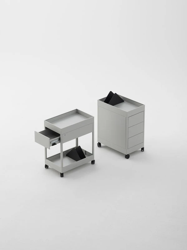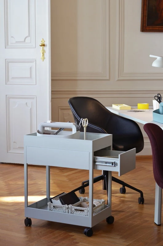 HAY’s New Order trolley A is equipped with one drawer, a tray top and a lock.