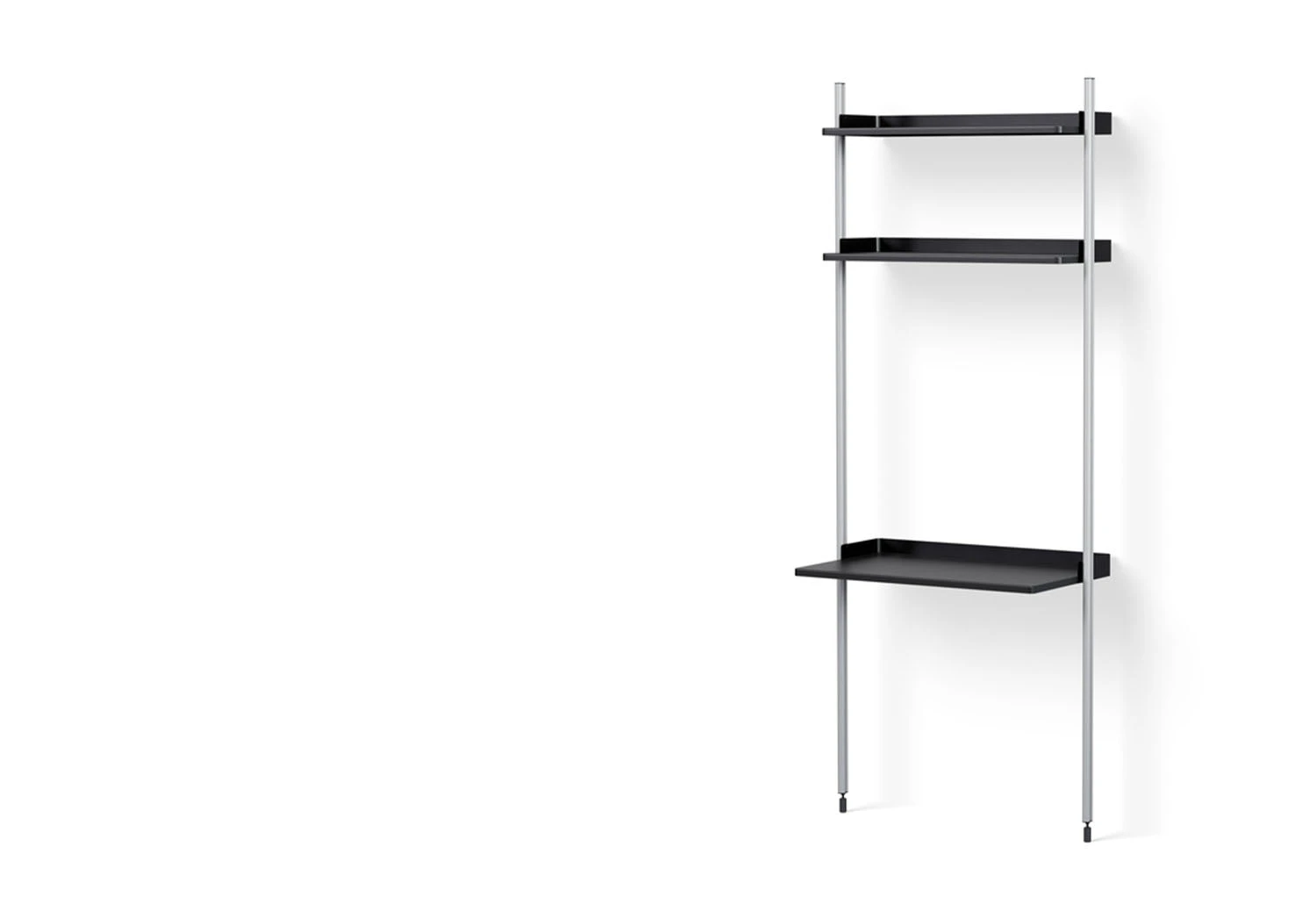 The minimalist shelving is available in several colours and pre-configured combinations, which include practical elements such as flat shelves, wire shelves, work desks, cabinets and clothing hooks. The combinations can be used alone or combined to create custom systems for your environment.