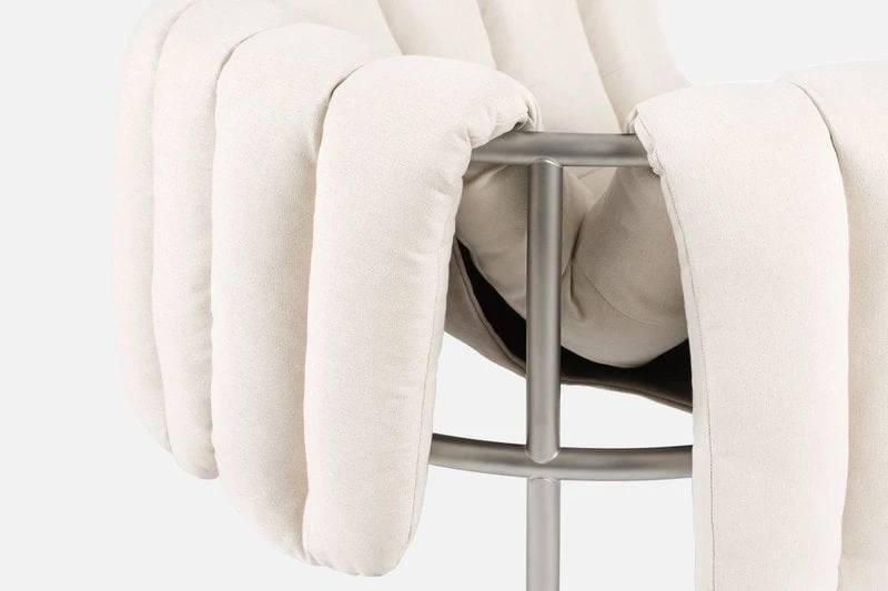 The Puffy lounge chair by Hem charms with a delightful contrast of forms and materials. Designed by Faye Toogood, Puffy consists of a streamlined, tubular steel frame and a plump, detachable upholstery that rests freely on the frame. The playful appearance of the Puffy lounge chair adds a relaxed touch to a living room or lobby, and its airy design easily blends into any kind of decor, minimalist or maximalist. Available in a range of colour and upholstery options.
