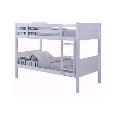 – White wooden bunk bed in a light antique finish. Wood slatted base.