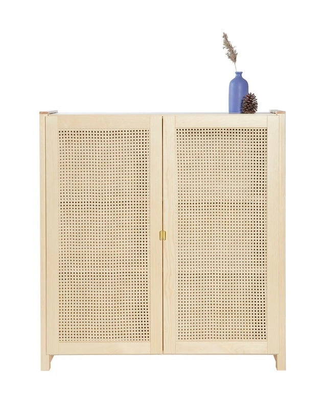 The Lundia Classic cabinet combines a trendy yet timeless rattan weave with the quality of Finnish woodworking. The cabinet doors are adorned with light, natural rattan weave, behind which are two solid wood shelves. The doors are perfected with brass handles and soft-close hinges.