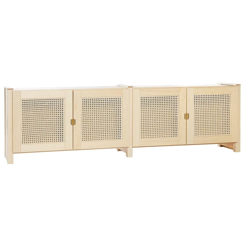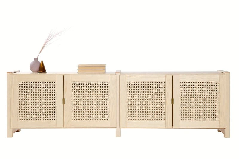 The Lundia Classic TV stand combines a trendy yet timeless rattan weave with the quality of Finnish woodworking. The cabinet doors are adorned with light, natural rattan weave, behind which is a solid wood shelf. The doors are perfected with brushed brass handles and soft-close hinges.