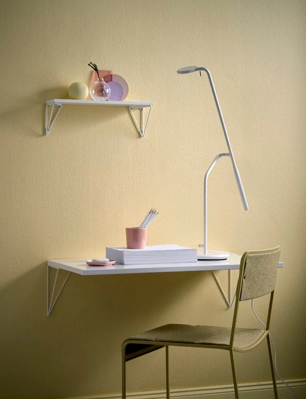 Pythagoras wall brackets, shelves and drawers give you the freedom to create shelves of various sizes, colours and shapes in any space. Use them to build a single wall shelf, bedside table, corner shelf, home office or large shelving module covering an entire wall. The wall brackets can be mounted either below or above the shelf or desk in four different positions, and their airy design leaves room for blank space as well. Play, experiment and create the perfect shelving unit, work-from-home setup or craft corner for your own needs!