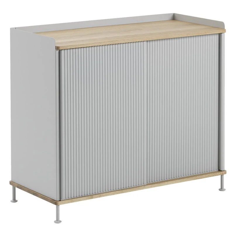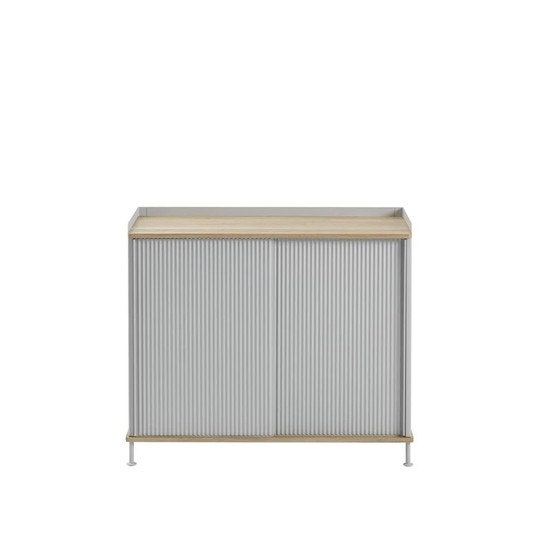 Muuto’s Enfold sideboard is characterized by a fine balance of industrial spirit and organic details. Designed by Thomas Bentzen, the Enfold sideboard combines a solid oak base and top with sliding doors made of powder-coated, pleated steel. The lightweight look of Enfold complements both homes and offices and easily finds its place in living rooms, kitchens and hallways alike. The high Enfold sideboard has two metal shelves that can be placed on the desired level behind the sliding doors.
