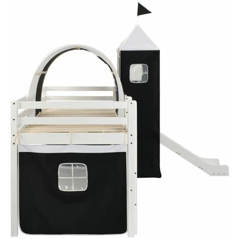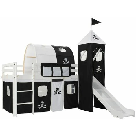 This pirate-themed children’s loft bed will be a real eye-catcher in your kid’s bedroom. The wooden loft bed has a solid construction and is delivered with the bed slats, a slide, a ladder, and a pirate-themed tent, side covers and a canopy. Guard rails on both bed edges will keep your little pirate in his or her bunk. The space underneath the bed transforms into the captain’s headquarters with the included sidewalls with windows. Additionally, the loft bed is distinguished by an entertaining slide and a ladder, both of which can be covered with the included tent. The slide and the ladder can be assembled either on the left or right, and a canopy for covering the bed is also included. The bed is suitable for 90 x 200 cm mattress. Your little one will love sleeping and playing in his or her very own pirate fortress! Please note that the mattress is not included in the delivery.