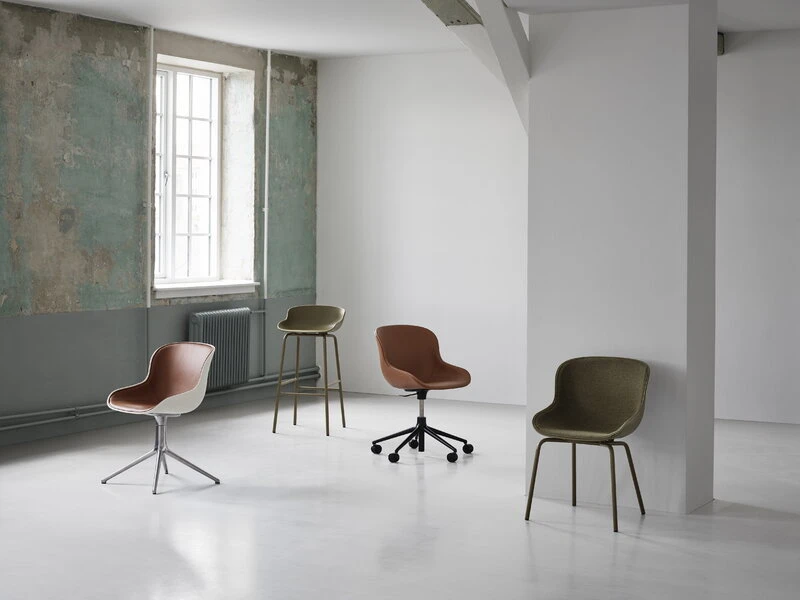 Normann Copenhagen’s Hyg swivel chair, with its voluminous silhouette and soft, curvy lines, exudes warmth and comfort. The inspiration behind the cosy Hyg collection is the word “hygge”: in the spirit of perhaps the most well-known word of the Danish language, designer Simon Legald wanted to create a shell chair with a sense of security and solace. The Hyg office chair is like a safe haven, a nest where you can feel comfortable, be it in your own study, a busy office or a conference room. The upholstered chair is equipped with wheels and is height-adjustable.