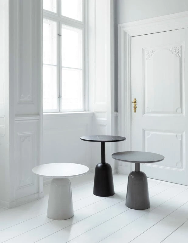 Normann Copenhagen’s Turn is an attractive, multifunctional side table designed by Simon Legald. The name Turn comes from the swivel structure of the table: by turning the tabletop, you can adjust the height of the table between 41,5 cm and 66,5 cm. The lower heights are great when using Turn as a coffee table or bedside table, and when turned higher, it makes an excellent side table in any room. The bell-shaped base is made of steel and the tabletop is ash veneer, and the monochrome coating gives the table a fresh, uniform look.