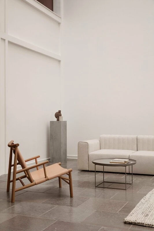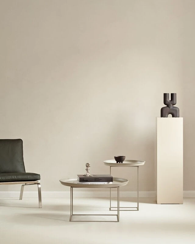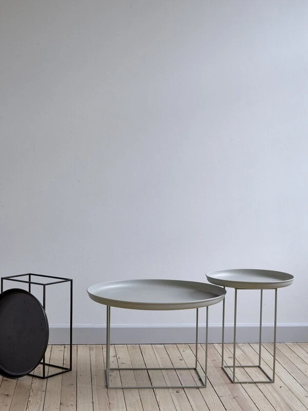 NORR11’s Duke coffee table is a modern and characterful tray table made of powder-coated steel. The Duke coffee table plays with basic geometric shapes, comprising a round tray top with edges and a sleek, rectangular base. The special feature of the Duke coffee table is its adjustable height: when lifting off the tabletop, you can rotate the base to change the height of the table.