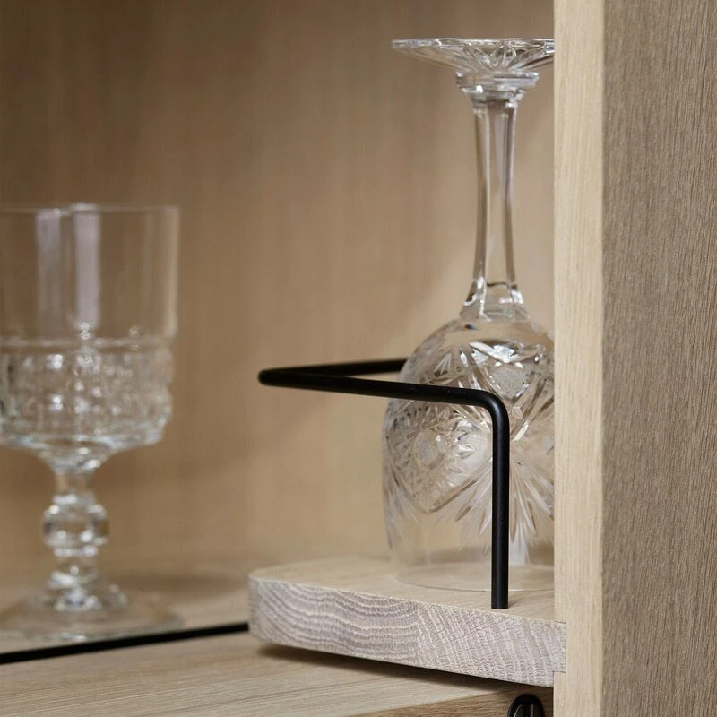 Northern’s Loud bar cabinet has everything you could want from a classic drink trolley. Inside the cabinet, you’ll find plenty of storage space for cocktail ingredients and barware. Metal edges surround the interior shelves to prevent items from sliding around, and metal brackets on the inside of the doors keep bottles upright when the bar cabinet is moved. The elegant bar cabinet is made of light oak.