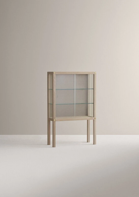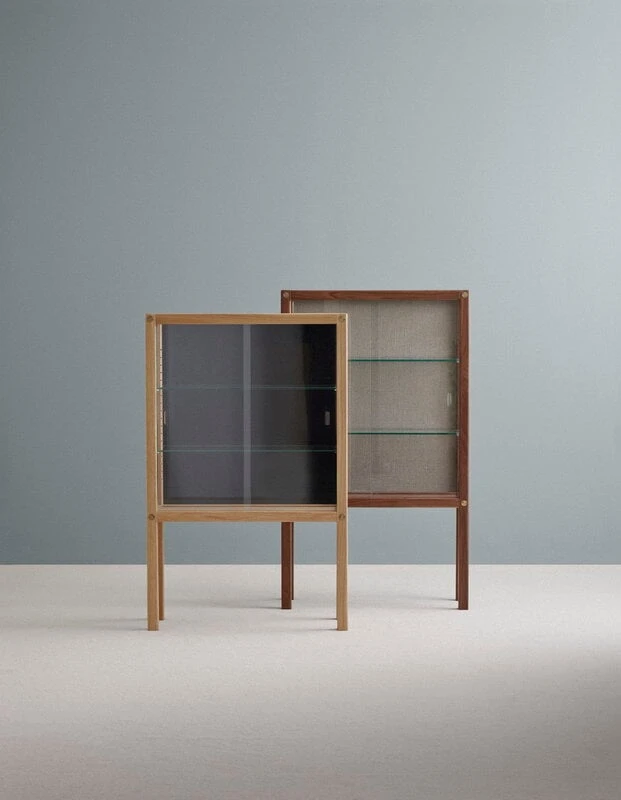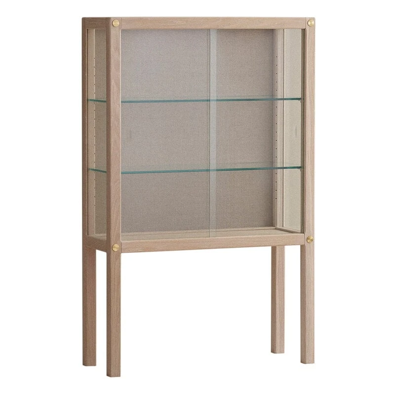 The Näyttely showcase by Ornäs combines a robust solid wood frame with transparent, almost invisible sliding glass doors and shelves. The raw linen lining of the back wall provides a soft, organic setting for books, tableware or decorative items placed in the display cabinet. The metal details add to the elegance of the Näyttely showcase.